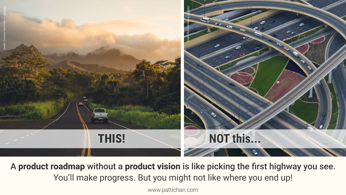 A casual poll of 5 out of 10 CTO and CPOs described their product vision as: "Could be better. We have a roadmap." Product roadmaps often stand in for product vision because both deal with the future. But following a roadmap with no product vision is like going on a road trip and picking the first highway you see on the rental car map. You'll start driving. You'll even make progress. But you may not like where you end up! There's lots of features on a roadmap, but a strong product vision will steer you towards the right features.